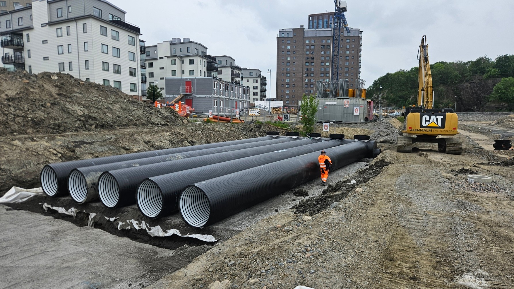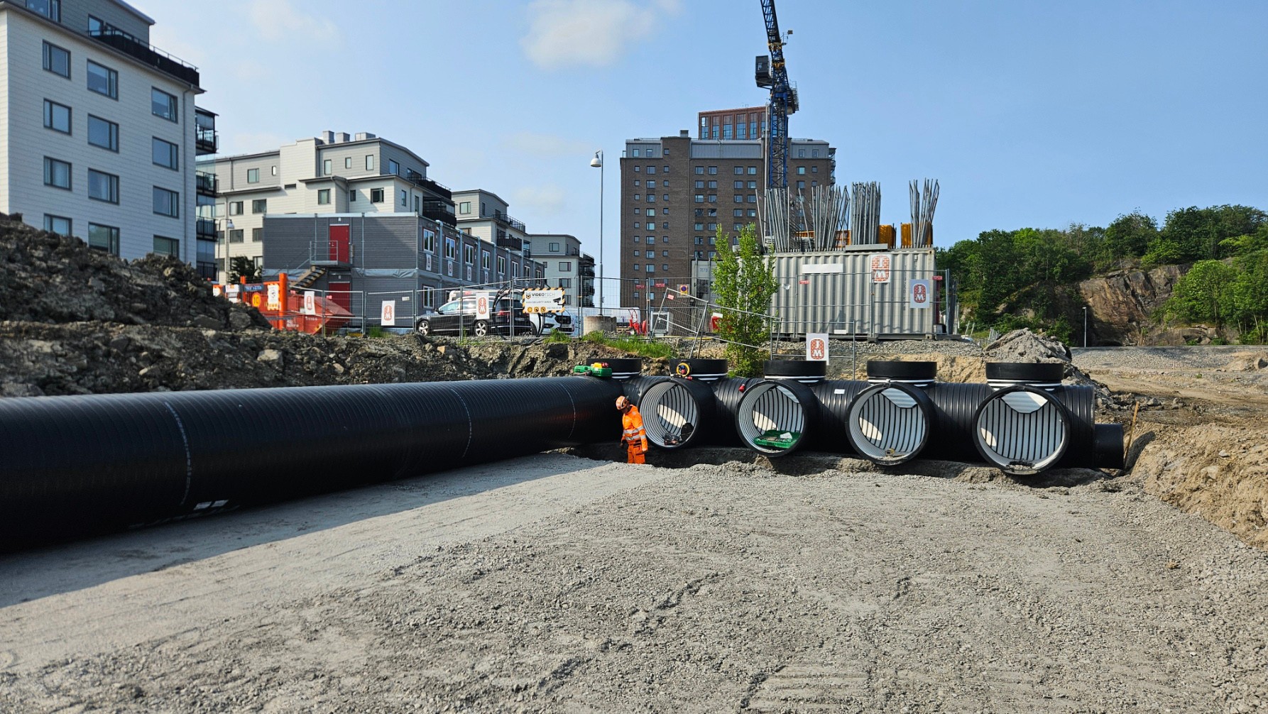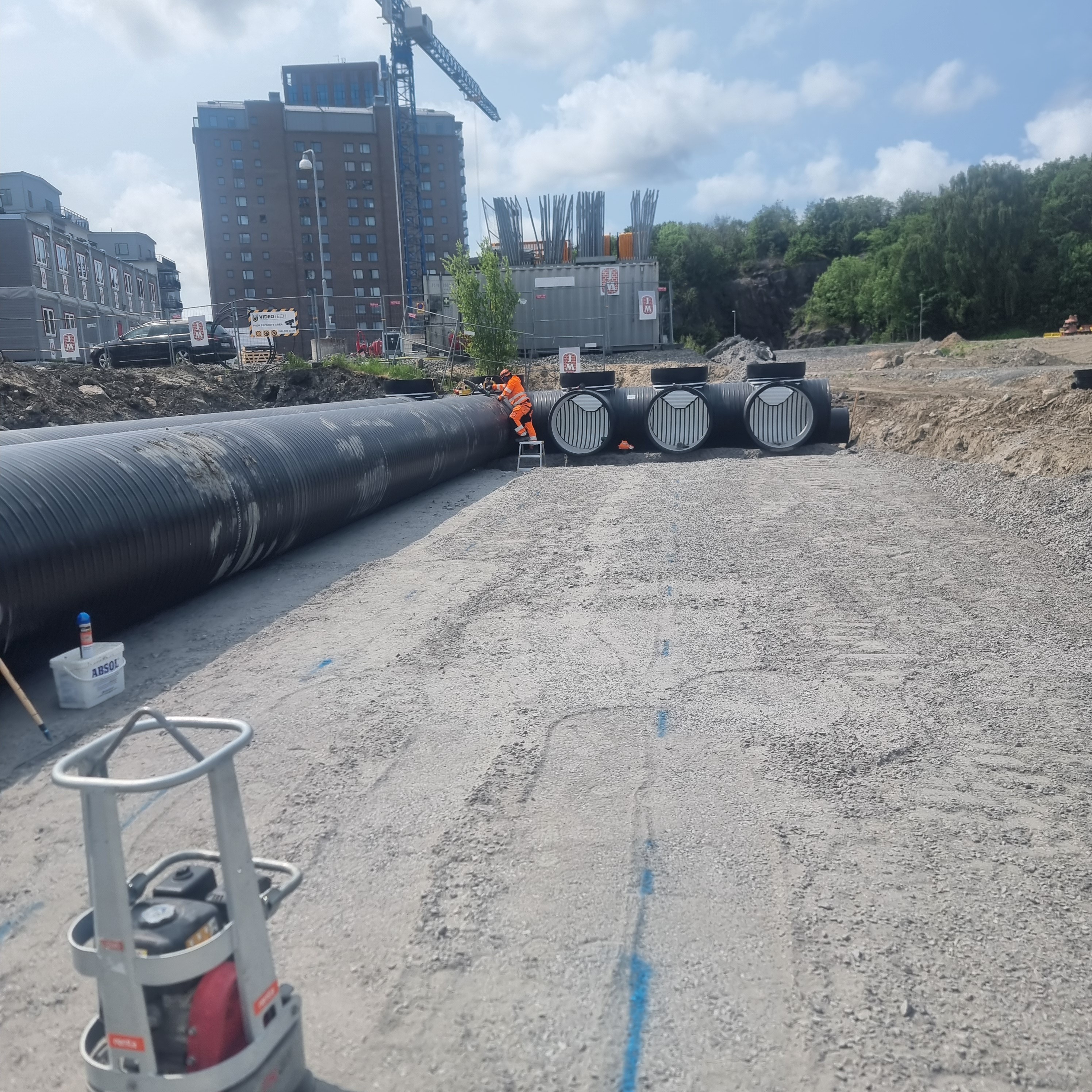 För att förverkliga projektet krävdes smarta och hållbara lösningar för dagvattenhanteringen. Pipelife har levererat ett utjämningsmagasin med kapacitet för cirka 300 m³ dagvatten, skräddarsytt enligt beställarens önskemål. Lösningen består av ett rörmagasin ID 1200 SN8 Infra XL med fem fördelningssträngar, där varje sträng är utrustad med nedstigningsmöjlighet.