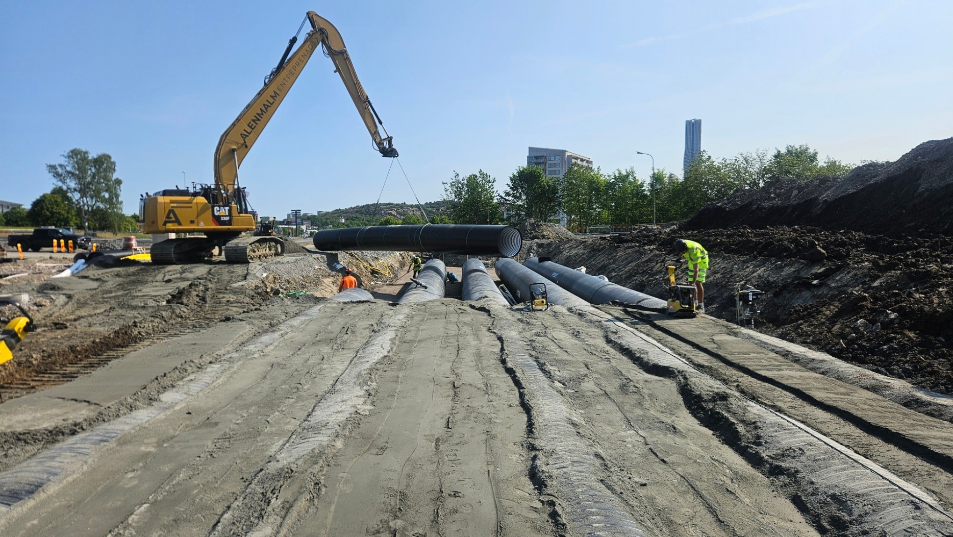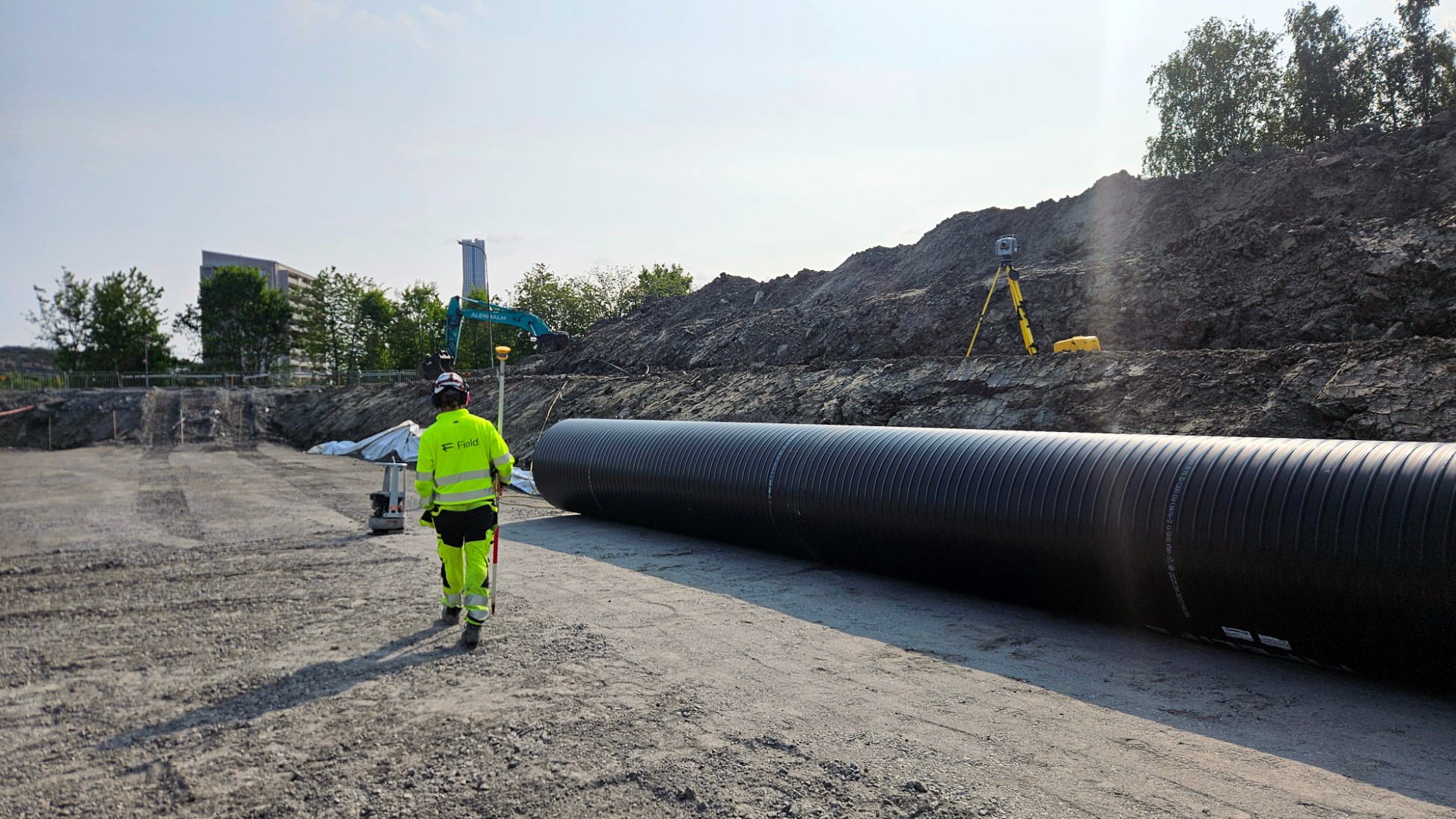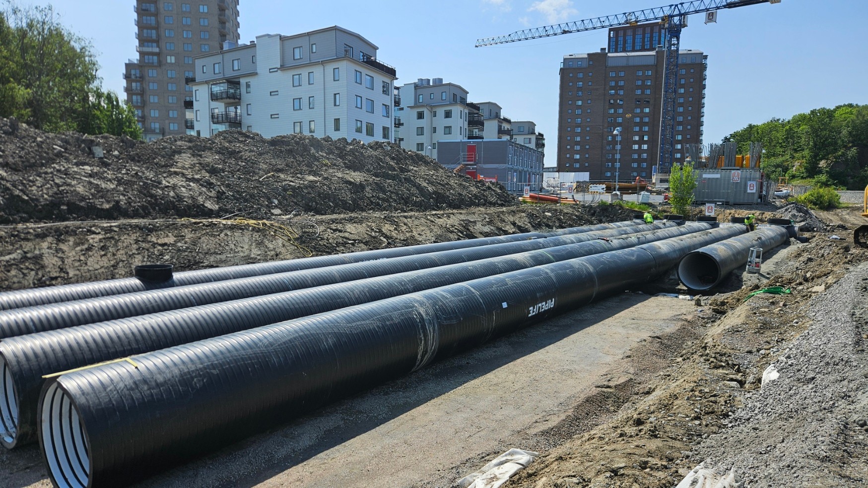 För att förverkliga projektet krävdes smarta och hållbara lösningar för dagvattenhanteringen. Pipelife har levererat ett utjämningsmagasin med kapacitet för cirka 300 m³ dagvatten, skräddarsytt enligt beställarens önskemål. Lösningen består av ett rörmagasin ID 1200 SN8 Infra XL med fem fördelningssträngar, där varje sträng är utrustad med nedstigningsmöjlighet.